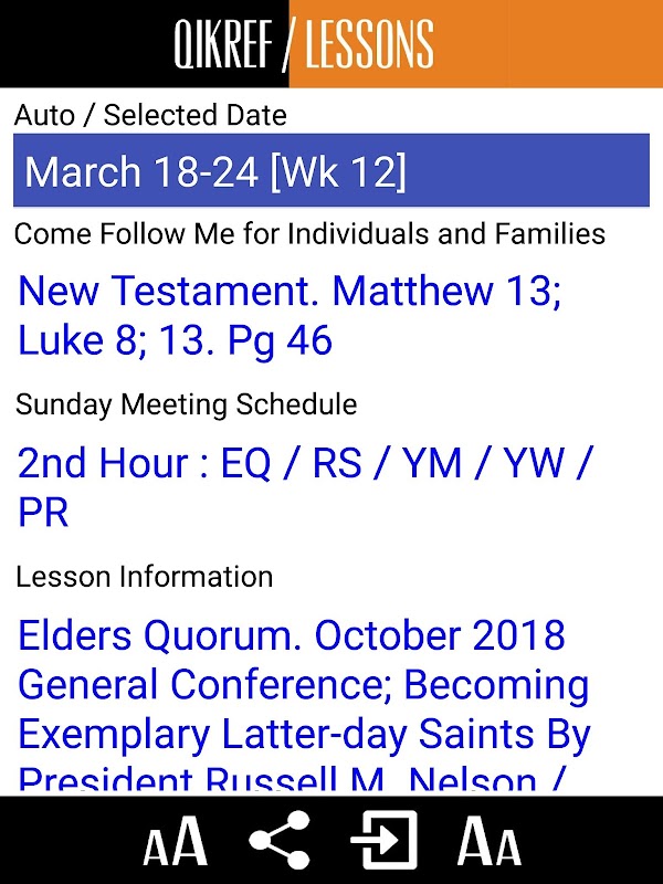 Easy to use with adjustable font size to suit phone or tablet. Great for making teaching assignments for specific dates or for checking what lesson to study for for the next Sunday.