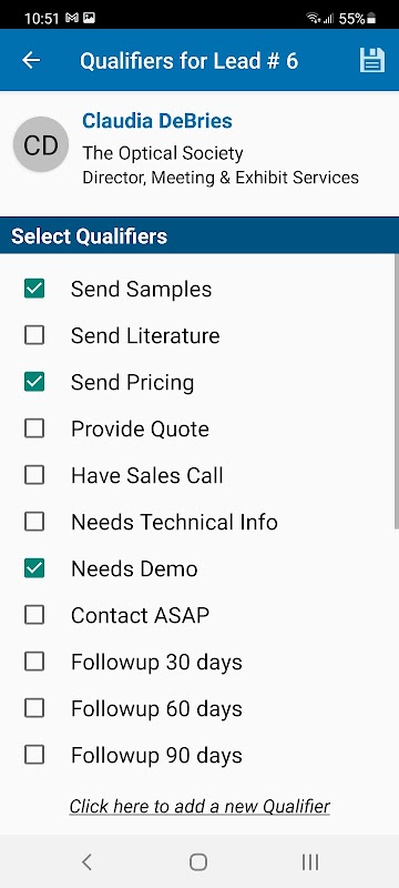 Enthält erweiterte individuelle Folgemaßnahmen aufgelistet, um die Aussichten in Sekunden zu qualifizieren. Zusätzliche Maßnahmen können spontan entweder von Ihrem Smartphone oder aus dem Web-Portal hinzugefügt werden.