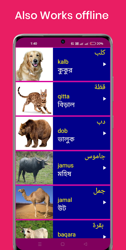 2. Jedes arabische Wort hat ein klares Bild 📸🖼️ und eine Audioaussprache 🎵🔊, um das Arabischlernen über Bangla einfach zu machen.