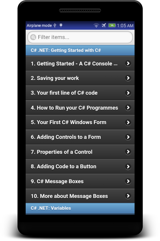 Learn C# - .Net - C sharp Programming Tutorial is a learning application covers all the Essentials of C sharp Programming language with with .Net and .ASP Frameworks explanation and use case and is suitable for both beginners and those who are looking for reference content.
