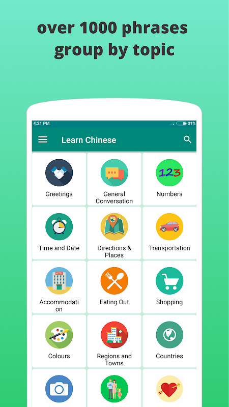 Learn Chinese Mandarin Free enthält über 1300 häufig verwendete chinesische Phrasen und Vokabeln für Reisende und Anfänger in 18 Kategorien.