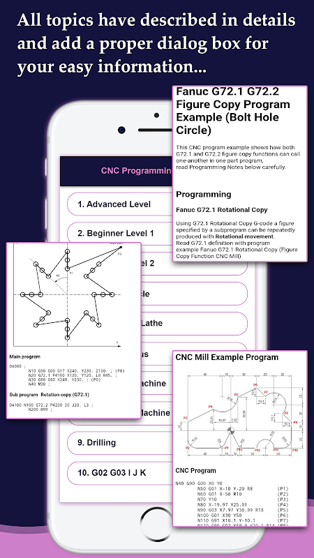 Beispiel zum Erlernen der CNC-Programmierung: Mit der CNC Mach-App können Sie anhand praktischer Beispiele ganz einfach die CNC-Programmierung erlernen. Mit dieser KOSTENLOSEN App erfahren Sie, wie Sie ein CNC-Programmierbeispiel und ein CNC-Tutorial verwenden. Diese Anwendung ist für Anfänger, Profis und Fortgeschrittene gedacht. Diese App ist nützlich für diejenigen, die mit dem Erlernen der CNC-Programmierung beginnen.