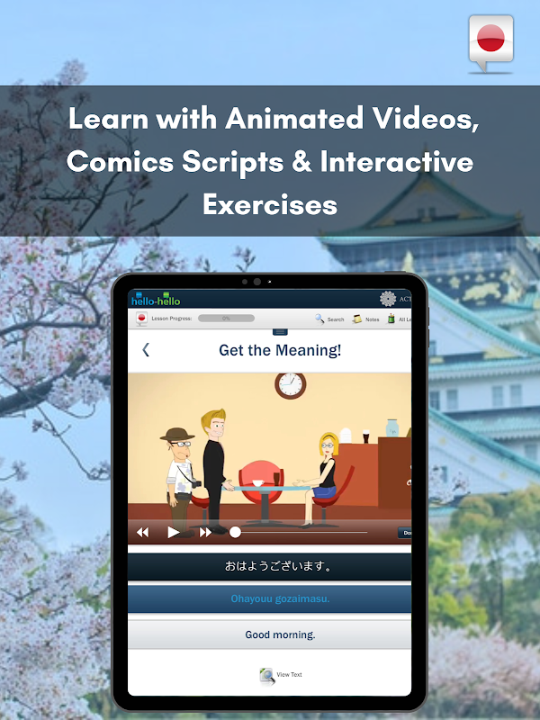 Hello-Hello Japanisch ist ein umfassender Sprachkurs mit 30 Lektionen, der in Zusammenarbeit mit dem “American Council on the Teaching of Foreign Languages (ACTFL)” entwickelt wurde. Du kannst also gewiss sein, dass die Lektionen einer effektiven, wissenschaftlich fundierten Methodik folgen. Der Fokus aller Lektionen liegt auf Kommunikation. Statt einer Liste von Vokabeln und Ausdrücken, die außerhalb eines Kontexts präsentiert werden, bietet dir jede Lektion authentische Dialoge und Alltagssituationen.
