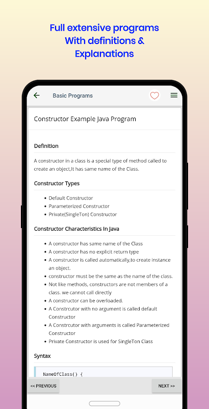 Diese Anwendung hilft Ihnen, Java-Programme zu lernen. Diese Anwendung ist für alle Arten von learners.This Anwendung sehr nützlich speziell für Java Anfänger.
