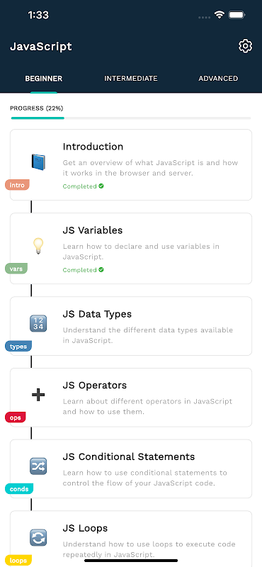 Mit unserer Learn JavaScript-App können Sie Programmierkonzepte unterwegs erkunden. Lernen Sie beim Pendeln, in Ihrem Lieblingscafé oder beim Entspannen zu Hause. Alles, was Sie brauchen, ist ein mobiles Gerät, um mit dem Lernen und Programmieren zu beginnen.