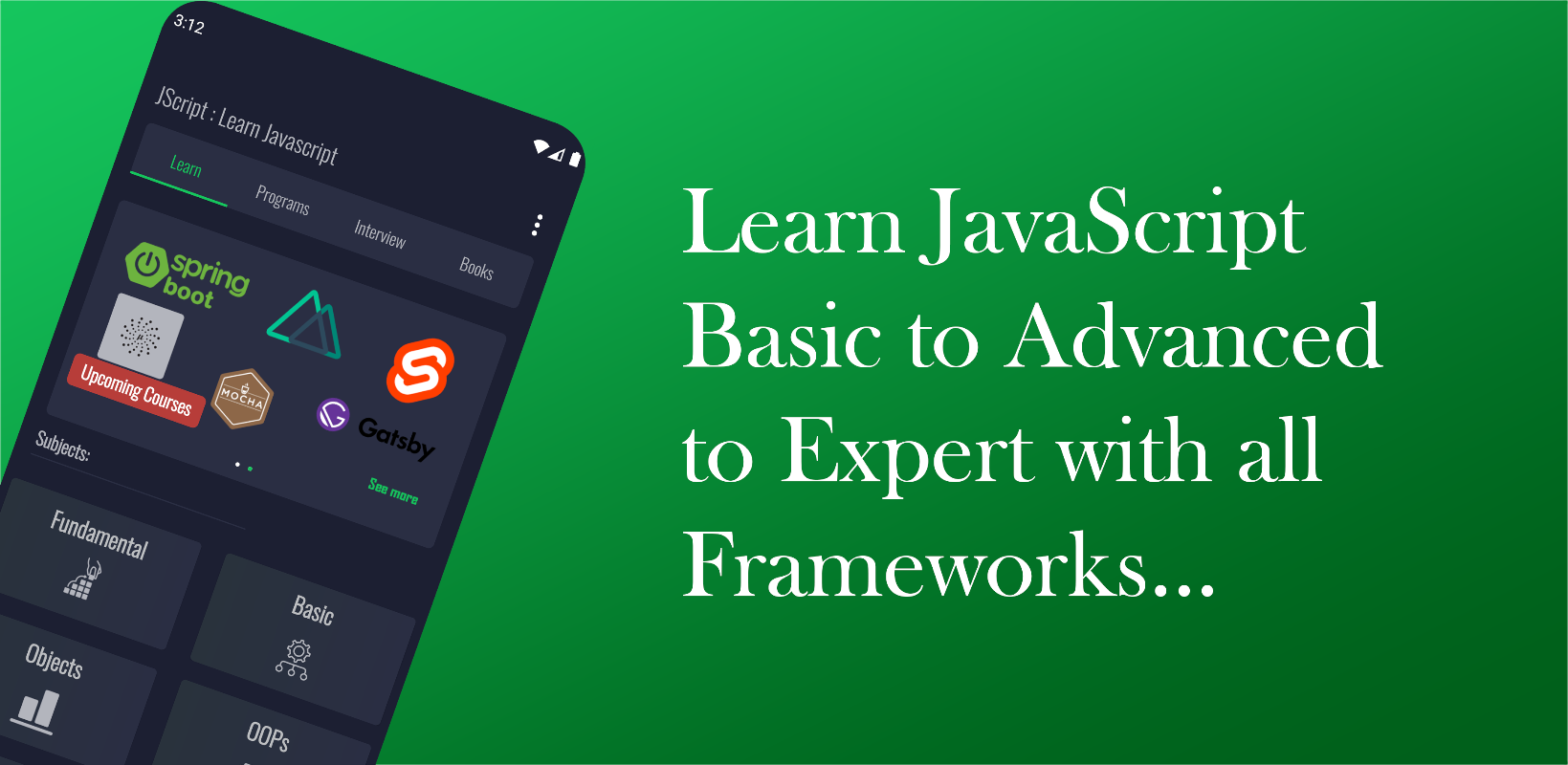 This amazing JScript: Learn JavaScript Learning app has amazing content such as JavaScript Programming Tutorials, JavaScript Programming Lessons, Practice Programs, Quizzes, Questions & Answers, and all that you need to either learn JavaScript programming basics or to become a JavaScript programming expert.