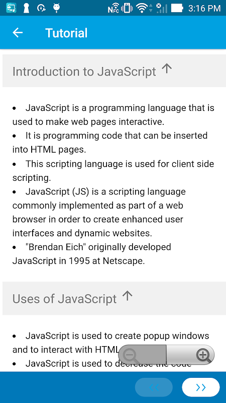 Sie haben nur eingeschränkten Zugriff auf die bereitgestellten Inhalte. Um vollen Zugriff auf den Inhalt zu erhalten, melden Sie sich bitte an und kaufen Sie diese Anwendung. Diese App bietet eine kurze Zusammenfassung der wichtigsten Konzepte in JavaScript in den folgenden Kapiteln in Snackgröße: