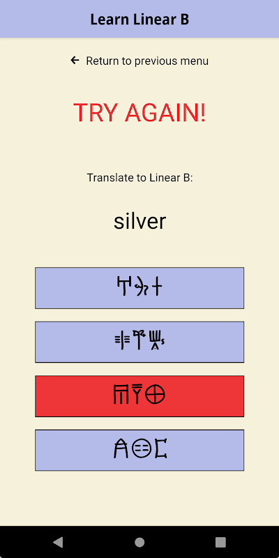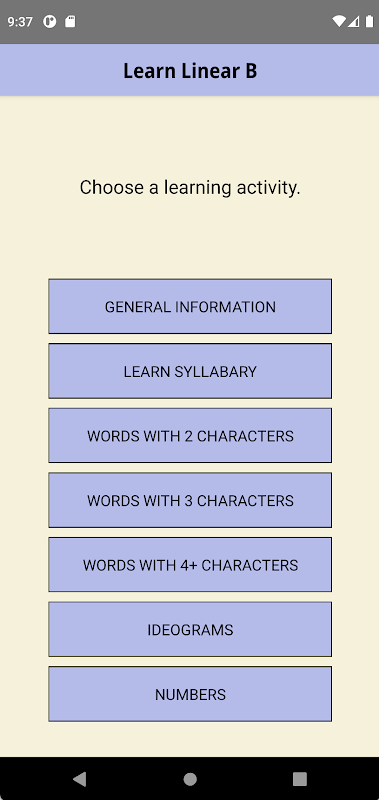 Der Zweck dieser App ist es, Ihnen beim Erlernen von Linear B, der alten Schrift der mykenischen Griechen, zu helfen. Die lineare B-Schrift erschien um 1450 v. Chr. Auf Kreta. Anscheinend entlehnten die mykenischen Griechen die Zeichen des linearen A-Schriftsystems der Minoer und passten diese Zeichen in ein neues System zum Aufschreiben ihrer Sprache an, die die früheste bekannte Form der griechischen Sprache ist. Diese App enthält Übungen im Quiz-Stil, mit denen Sie die einzelnen linearen B-Zeichen lernen und dann mit der Sondierung und Übersetzung von linearen B-Wörtern fortfahren können.