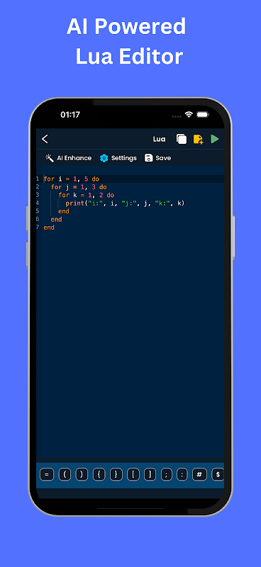 Integrierter Lua-Code-Editor: Mit dem integrierten Code-Editor können Sie Lua-Code sofort schreiben, bearbeiten und ausführen. Der syntaxbewusste Editor bietet Echtzeit-Feedback und Fehlerhervorhebung und hilft Ihnen so, sauberen, korrekten Code zu schreiben. Egal, ob Sie mit String-Manipulationen experimentieren, Funktionen schreiben oder ein Minispiel erstellen, alles geschieht innerhalb der App – kein Laptop oder eine externe IDE erforderlich.