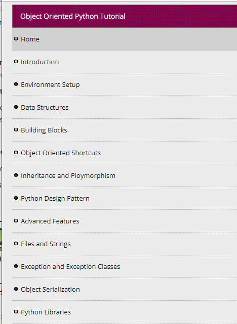 Object Oriented Python Quick Guide - Learn Object Oriented Python in simple and easy steps starting from basic to advanced concepts with examples including Introduction, Environment Setup, Data Structures, Building Blocks, Object Oriented Shortcuts, Inheritance and Polymorphism, Python Design Pattern, Advanced Features, Files and Strings, Exception and Exception Classes, Object Serialization, Python Libraries.