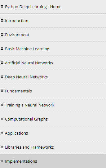 "Python Deep Learning - Introduction","Python Deep Learning - Environment","Python Deep Basic Machine Learning" , "Artificial Neural Networks" , "Deep Neural Networks" , "Python Deep Learning - Fundamentals" , "Training a Neural Network" , "Computational Graphs" , "Python Deep Learning - Applications" , "Libraries and Frameworks" , "Python Deep Learning - Implementations"
