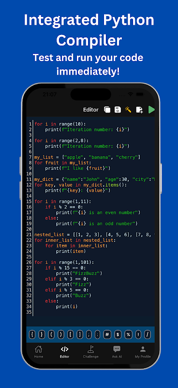 Integrierte IDE: Üben Sie das Codieren direkt in der App. Mit unserem integrierten Python-Editor können Sie Python-Code schreiben, ohne dass externe Tools erforderlich sind. Mit dem Python-Compiler können Sie Ihren Code sofort testen, um sicherzustellen, dass er wie erwartet ausgeführt wird.