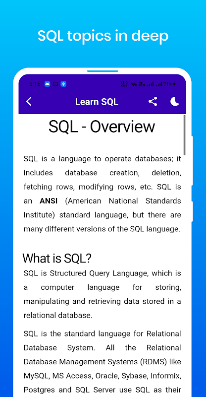 Learn SQL hat eine wirklich einfache Benutzeroberfläche. Es ist die beste App, mit der Sie die Programmiersprache SQL kostenlos lernen können. Laden Sie die App jetzt herunter, um ein Learn SQL zu werden.