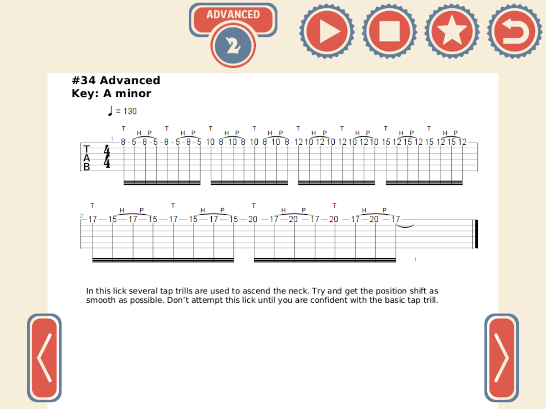 ● Diese App wurde für fortgeschrittene Gitarristen entwickelt und ist nicht für Anfänger geeignet. Es wird empfohlen, dass Sie die Grundlagen des Leadgitarrenspiels einschließlich Biegungen, Hammer-Ons und Pull-Offs verstehen, bevor Sie diese Lektionen versuchen.