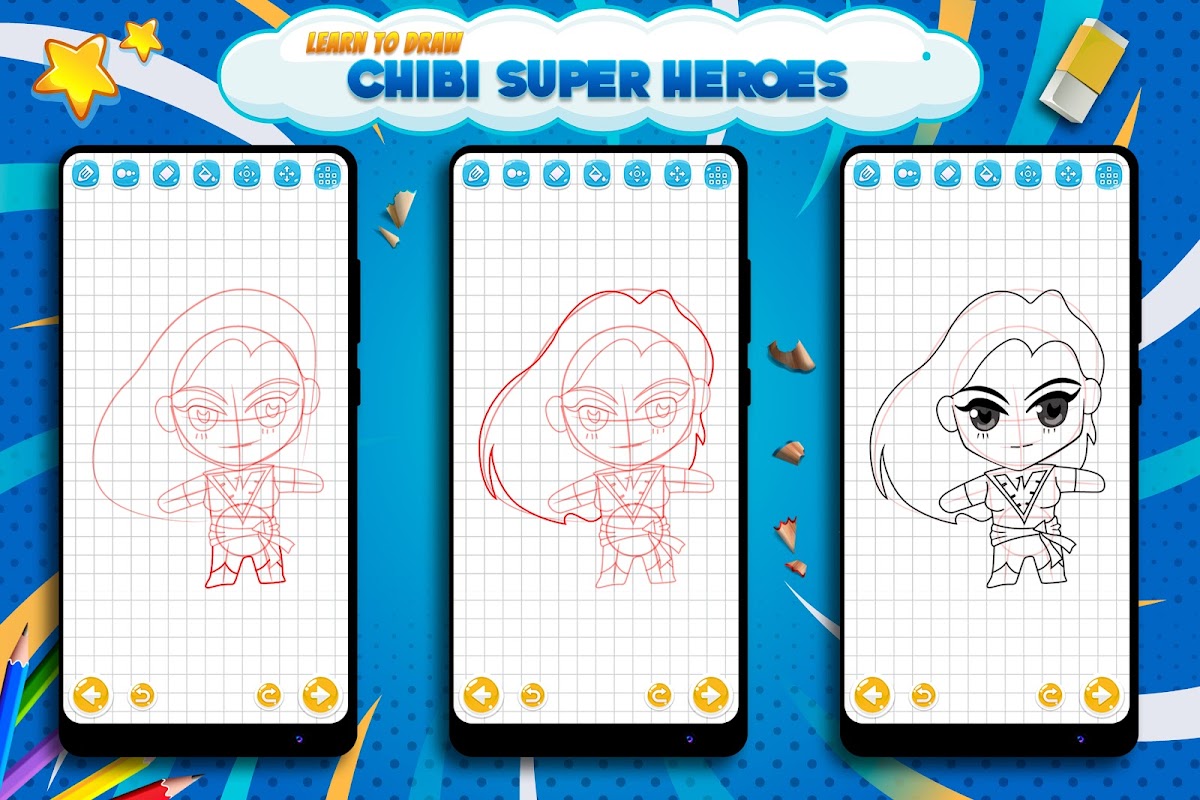 Sie brauchen keine besonderen Fähigkeiten, fangen Sie einfach an zu zeichnen, seien Sie kreativ und beeindrucken Sie Ihre Freunde und Familie mit Ihren erstaunlichen Fähigkeiten, indem Sie diese kostenlose Chibi Superhero Drawing Book App verwenden.