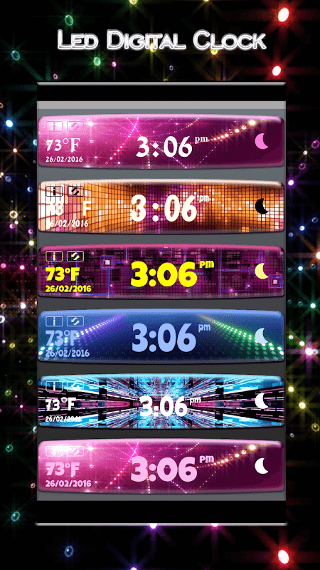 Sind Sie bereit, etwas geführt Stil auf dem Telefon zu setzen? Wenn Sie sind, kostenlos herunterladen Led Digital Uhr für Home-Bildschirm und genießen! Schalten Sie das LED-Licht und verschönern Sie Ihren Bildschirm mit "freien Digitaluhren"! Dies ist die moderne Art und Weise, wie Sie Ihre mobilen Desktop anpassen! Ändern Sie die LED-Hintergrund Haut jedes Mal, wenn Sie mit brandneuen Widget Digitaluhr wollen. Viele bunte Designs der Uhren wird Ihr Smartphone auf fabelhafte Weise dekorieren! Entdecken Sie alle Funktionen dieser "führte Uhr"! Lassen Sie sich über die neuesten Wetterbedingungen informiert und nehmen für Tablette diese Welt Uhr. Wenn Sie sich für moderne Uhren der Suche habe, diese "neue Uhr app" werden alle Ihre Gelüste befriedigen. Nehmen Sie dieses "führte Widget App" und zeigen Sie Ihren Sinn für Stil. Klicken Sie einfach auf kostenloser Download und bieten sich eine erstaunliche Sammlung von LED-Uhren mit verschiedenen Größen und Formen. Wählen Sie einfach die Haut Uhr Farbe und lassen Sie Ihr Telefon glänzen mit schwarz, weiß, violett und grün.