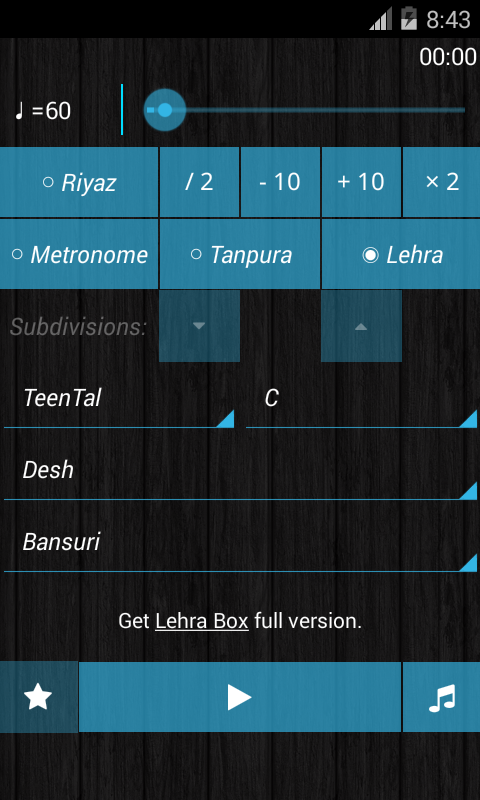 LehraBoxLite ist eine Lite-Version von LehraBox, einem lehra oder Nagma-Player für Ihr Android-Gerät. LehraBoxLite spielt eine rhythmische Melodie, die für die Wiedergabe von Tabla als Begleitung dient. Es ist beabsichtigt, für die Bereitstellung und eine konstante Geschwindigkeit oder Schläge pro Minute zu halten, während spielen oder die Tabla zu üben. Einige der wichtigsten Merkmale und Einschränkungen in der Lite-Version sind