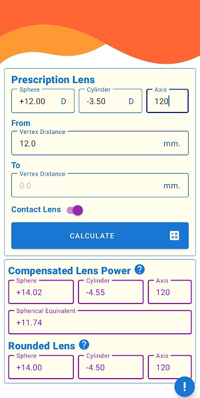 * Berechnen Sie das sphärische Äquivalent der kompensierten Linsenstärke, damit es für Kontaktlinsen verwendet werden kann, z.