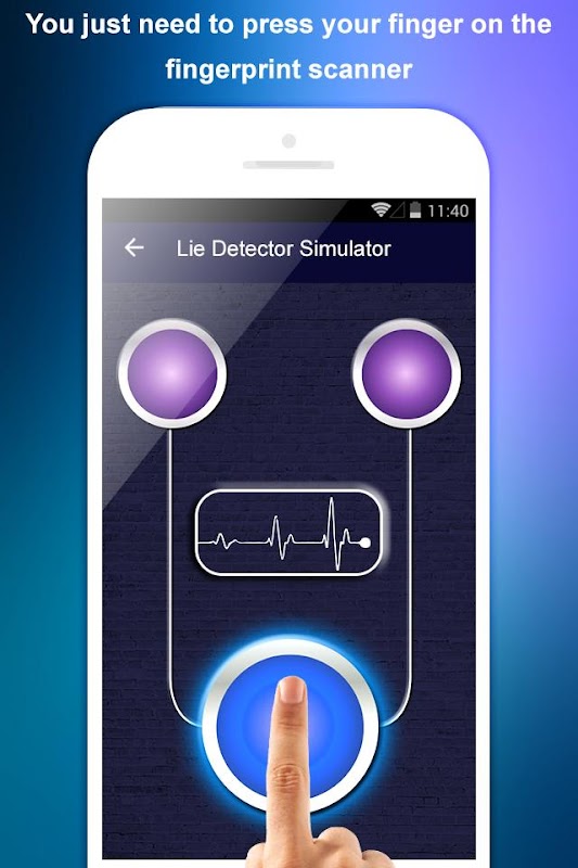 Lie Detector Test Free is a funny game which simulates to detect whether you tell the truth or lie. You just need to press your finger on the fingerprint scanner and then the Lie detector app will scan your finger and calculates the result, true or false.