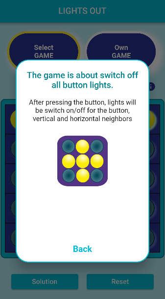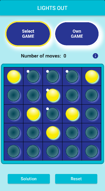 Die Aufgabe des Spiels ist es, alle beleuchteten Tasten auszuschalten. Nach dem Drücken der Taste wird das Licht für die Taste und ihre vertikalen und horizontalen Nachbarn ein-/ausgeschaltet. Es gibt voreingestellte Konfigurationen im Spiel, oder Sie können Ihre eigene Konfiguration festlegen und spielen. Das Spiel ist sehr anspruchsvoll für die Vorstellungskraft und daher sind die voreingestellten Konfigurationen einfacher. Für jede lösbare Konfiguration kann die optimale Lösung angezeigt werden.