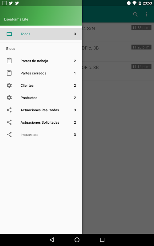 Eseaforms Lite te permite tener una base de datos de clientes, productos, actuaciones solicitadas y realizadas, crear partes de trabajo y generar PDFs con los datos introducidos, además de capturar la firma de tus clientes.