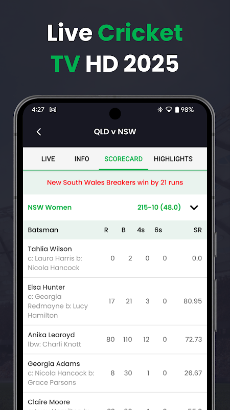 In dieser App erleben Sie Live-Cricket-Action mit Echtzeit-Ergebnissen und sofortigen Spielaktualisierungen. Bleiben Sie mit jedem Moment des Spiels in Verbindung – jederzeit und überall!