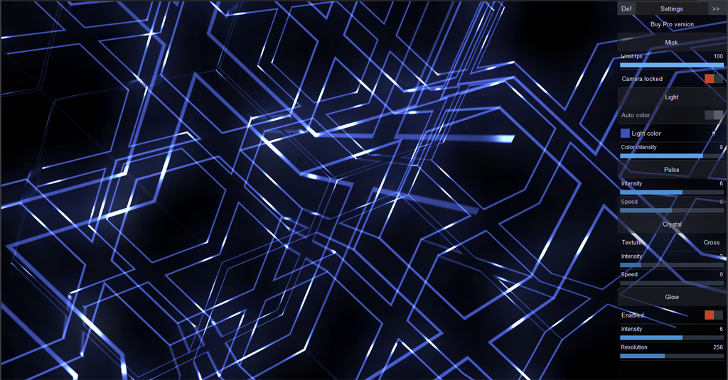 The living internal structure of a fictional crystal, with the movement of the pulsating current along the internal faces, with the choice of several textures and various lighting settings. The gyro sensor is used to increase the 3D effect.