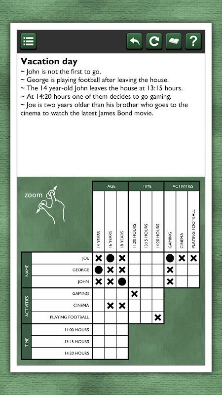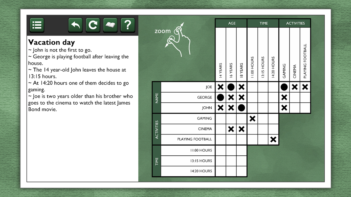 Entschlüsseln Sie schriftliche Hinweise und verwenden Sie das Raster, um eine Beziehung zwischen zwei Elementen zu markieren und die anderen Möglichkeiten auszuschließen und das Rätsel zu lösen.