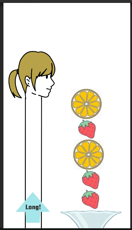 Wenn Sie auf den Bildschirm tippen, werden an der Stelle, an der Sie getippt haben, Parfait-Toppings angezeigt. Es ist ein Spiel, bei dem das Ziel darin besteht, die Anzahl der Beläge zu erhöhen, indem man sie übereinander stapelt, ohne dass sie auseinanderfallen. Der Rekord wird während der Game-Over-Szene bekannt gegeben. Gleichzeitig wird durch Drücken der Taste mit der Aufschrift „Lang!“ der Hals des Spielers auf die Höhe des Parfaits gestreckt. Das Spiel ist beendet, wenn der Kopf des Spielers den Bildschirm verlässt oder der Belag auf den Tisch fällt.