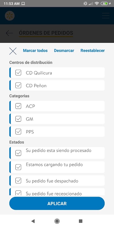 Die interne Anwendung von Walmart Chile zum Anzeigen einer Liste von Bestellungen, die an Geschäfte gesendet werden. Während des Vorgangs kann der Benutzer die Nachverfolgung und Verteilung jeder Bestellung anzeigen.