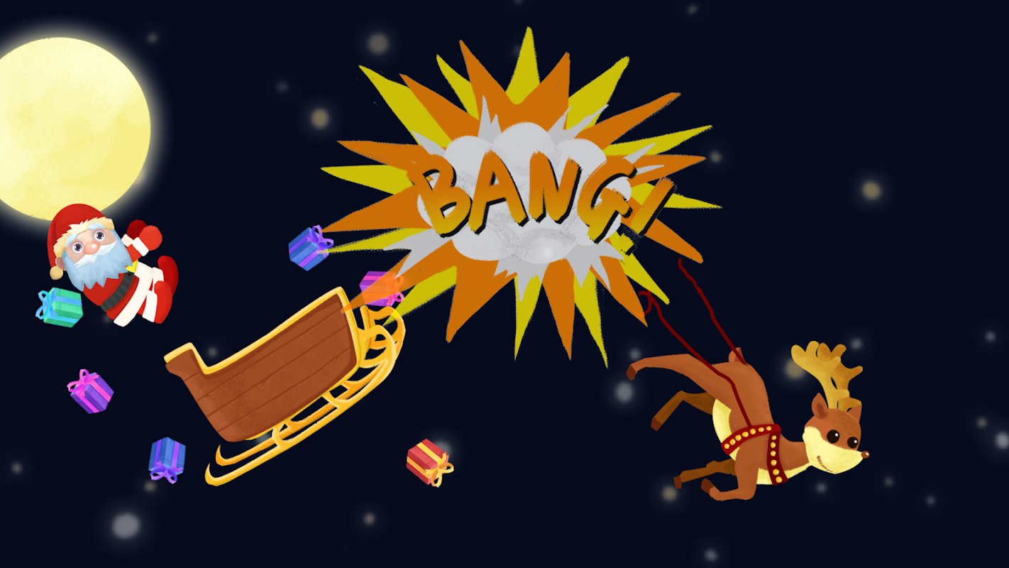 This is what happened three days before Christmas Eve. Santa Claus is on his way home with Christmas presents. Suddenly Santa heard a strange noise! A meteorite rushes into the atmosphere and approaches quickly. Santa's sleigh was knocked over and all the presents were scattered out.