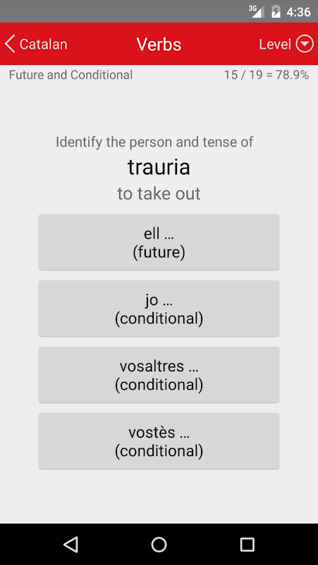 Wenn Sie das Telefon und einen freien Moment haben, bietet es eine kontinuierliche Multiple-Choice-Test auf katalanische Vokabular und Konjugation. Jede Antwort, die Sie geben, wird sofort bestätigt oder korrigiert, und Ihr Wissen wird durch Wiederholung verstärkt. Setzt unter diesen sind kumulativ Ebenen der Überprüfung, was bereits früher gelernt.