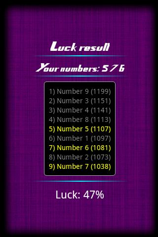 Select three numbers and see if you are lucky! The application is generating 10000 numbers from 1 to 9 and counts every number. Finnaly a luck procentage is generated considering the numbers that you choosed and they're order! Have fun :)