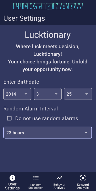 Geben Sie Ihr Geburtsdatum ein und legen Sie eine Zeit für zufällige Benachrichtigungen fest, um rechtzeitig Vorschläge nur für Sie zu erhalten.