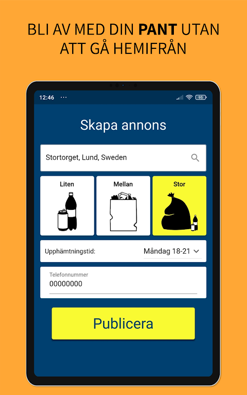 Wir von LundaPant wollen das Verpfänden noch einfacher machen und dafür sorgen, dass noch mehr aller Dosen und Flaschen wirklich verpfändet werden. Daher können Sie, die in Lund wohnen, Ihr Pfand direkt von zu Hause aus loswerden, anstatt Ihre Taschen zum Lebensmittelgeschäft schleppen und mit klebrigen Dosen anstehen zu müssen.