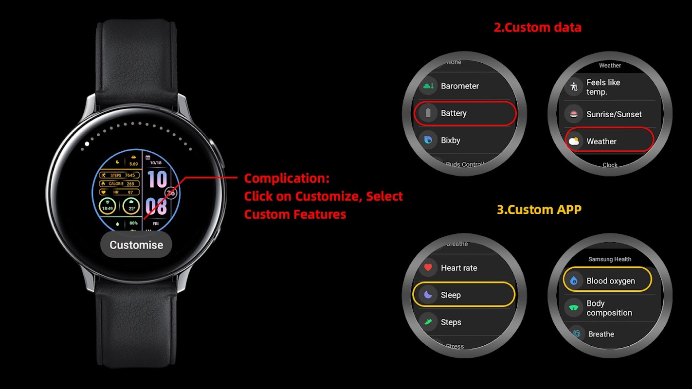1. Links: Benutzerdefinierte APP, Distanz, Schritte, Kalorien, Herzfrequenz, benutzerdefinierte Daten, benutzerdefinierte APP, Akkustand
