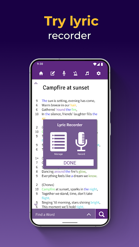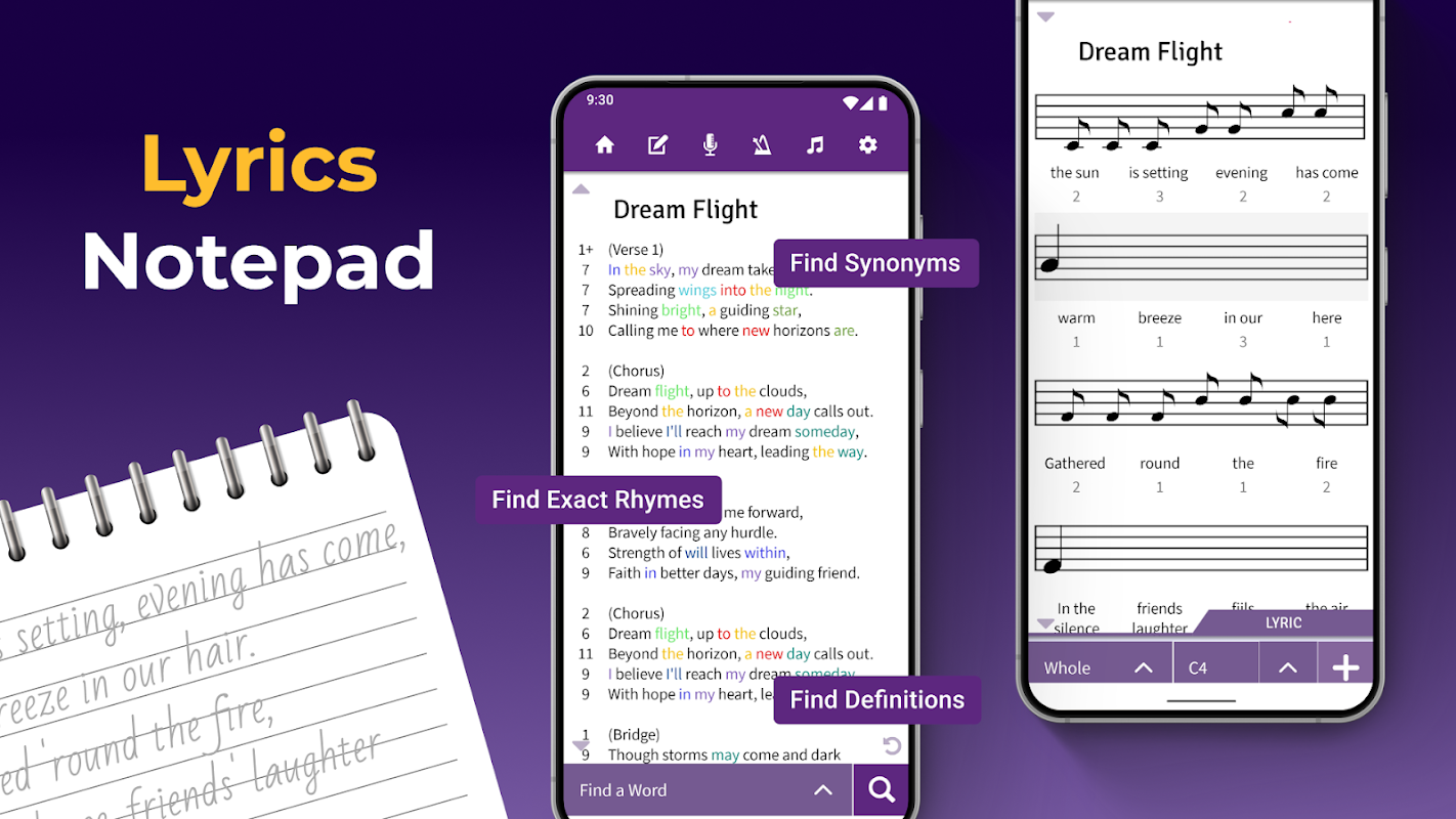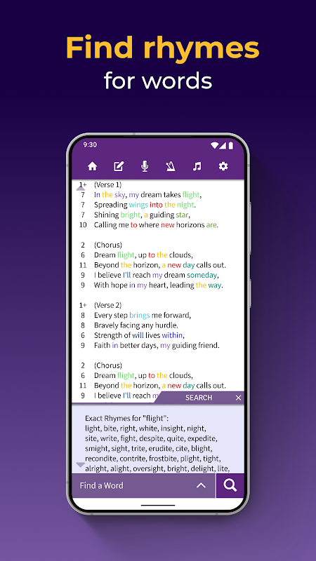 Das Lieder-Notizbuch analysiert die gesungenen Texte und schlägt mithilfe von Farbcodes passende Reime vor. Du kannst die Empfindlichkeit einstellen, um deine Rap-Texte oder Gedichte zu verfeinern.