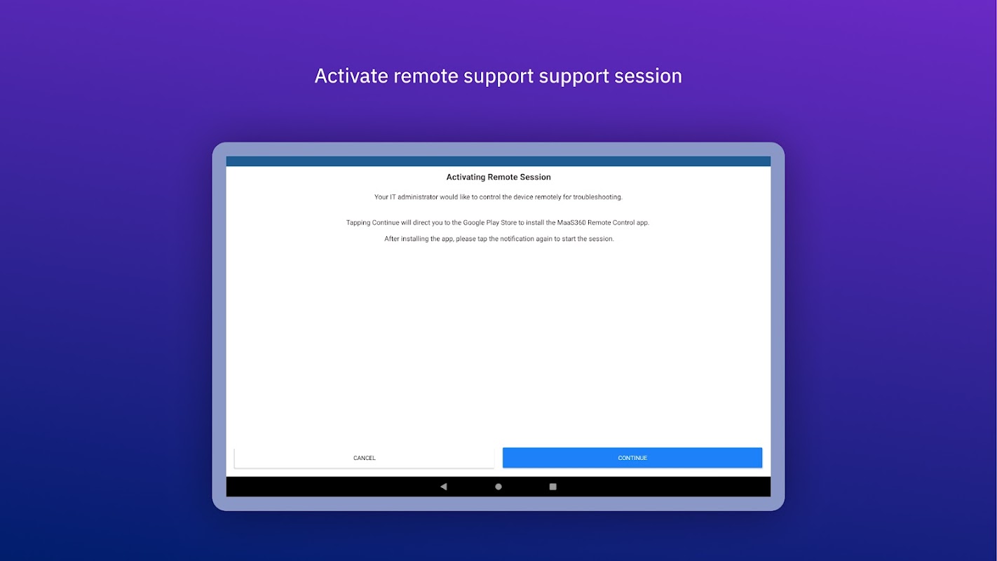 IBM MaaS360 Remote Support ist ein Modul für IBM MaaS360. Mit diesem Add-on kann sich Ihr IT-Helpdesk bei Ihrem Gerät anmelden und aus der Ferne bei der Behebung etwaiger Probleme helfen. Bei Samsung-Geräten bietet dies die Möglichkeit, das Gerät aus der Ferne anzuzeigen und zu steuern. Bei anderen Geräten hingegen bietet es die Möglichkeit, das Gerät nur aus der Ferne anzuzeigen. Der IT-Abteilung muss die Erlaubnis erteilt werden, bevor sie Ihr Gerät steuern kann. Erfordert IBM MaaS360 und ein Konto bei IBM MaaS360.