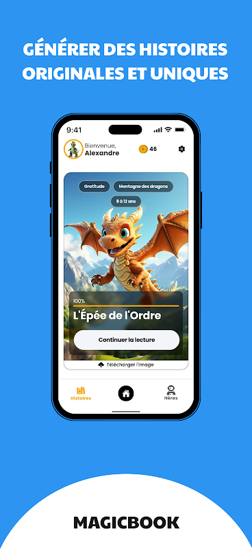 Erstellen Sie mit Magicbook einzigartige und fesselnde Geschichten für Kinder im Alter von 3 bis 12 Jahren. Personalisieren Sie jedes Abenteuer mit dem Vornamen, dem Aussehen und sogar einem Begleiter, der Ihr Kind auf seiner Reise begleitet.