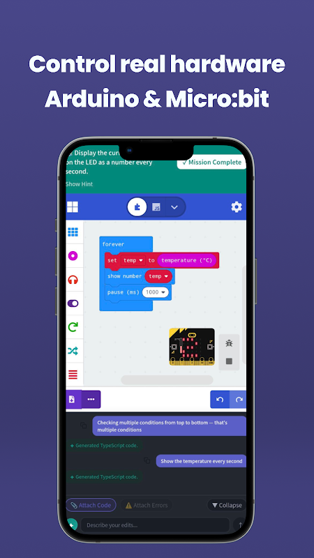 Programmiere Arduino und Micro:bit mit KI – direkt auf deinem Smartphone. Entwickle Spiele, führe Simulationen durch und steuere echte Hardware im Handumdrehen. Kein PC erforderlich. Starte in wenigen Minuten mit dem Programmieren.