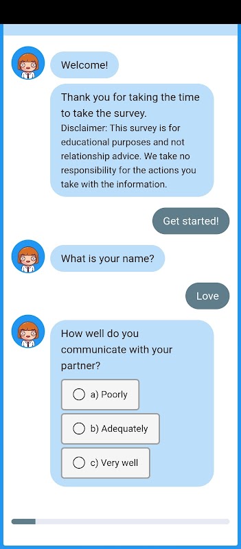Ansprechender Fragebogen: Unsere App bietet eine sorgfältig zusammengestellte Reihe anregender Fragen, die von Beziehungsexperten entwickelt wurden. Diese Fragen decken verschiedene Aspekte Ihrer Beziehung ab, von Kommunikation und Werten bis hin zu gemeinsamen Interessen und langfristigen Zielen. Indem Sie sie ehrlich beantworten, begeben Sie sich auf eine Reise der Selbstfindung und Beziehungsbewertung.