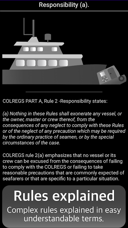 Unsere App-weite Regelschaltfläche vereinfacht die Navigation im COLREGS-Regelwerk. Mit einem einzigen Klick erhalten Sie schnellen Zugriff auf die relevante COLREG-Regel für die jeweilige Frage und sparen so wertvolle Lernzeit.
