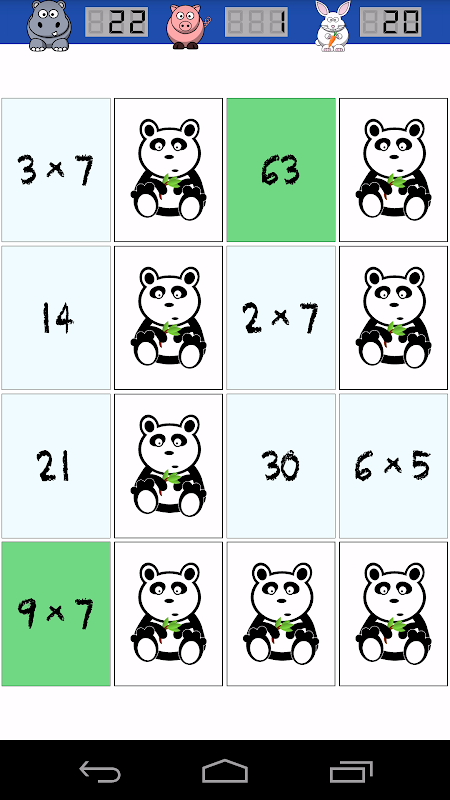 Im Klassenzimmer-Modus wählst du Addition, Subtraktion, Multiplikation und Division sowie den Schwierigkeitsgrad. Math Panda präsentiert dir Matheaufgaben in einer spielerischen Umgebung ohne Zeitlimit. Nilpferd zählt richtige Antworten, Schwein zählt falsche Antworten und Kaninchen zeigt die verstrichene Zeit an. Im Herausforderungsmodus versuchst du, so viele Aufgaben wie möglich in zwei Minuten zu lösen, um neue Runden Konzentration freizuschalten. Math Pandas Version von Konzentration, auch bekannt als Memory oder Paare, ordnet Matheaufgaben Lösungen zu. Kombiniere 2+2 mit 4 oder 6x7 mit 42. Math Panda Konzentration macht das Üben so unterhaltsam, dass es süchtig macht! Gönn dir zum Abschluss eine Runde Komparator mit mehreren Antworten oder fordere deine Freunde heraus, um zu sehen, wer die höchste Punktzahl erzielt!