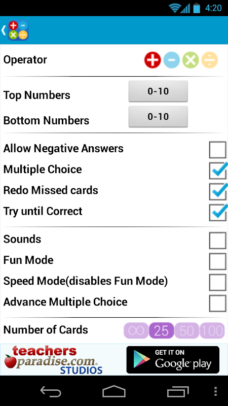 Math Practice Flash Cards von TeachersParadise.com Studios. Ein lustiges Spiel zu üben Addition, Subtraktion, Multiplikation oder Division.