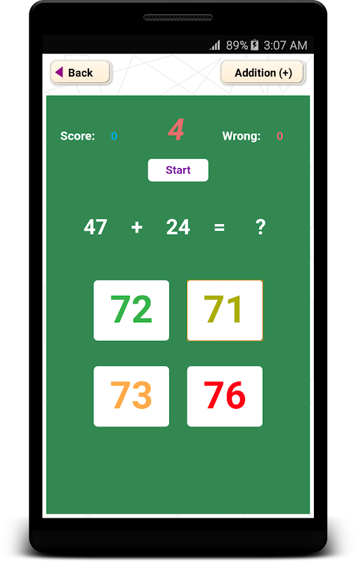 Math quiz addition is a cool math games for all the people who love mathematics and as well as math games for all students. Here is no math tricks just only math equation problems, you have to find out correct answer from four options. Like other math games online it has couple of categories. The categories name are Addition, Subtraction, Multiplication, Division and Undefined. By this category name you can easily understand their type of problems. Undefined category is kind of combo of all others categories. When you enter any of this category please press the start button to play this game. Game period is forty five seconds. Try to give maximum answer in this short time. Hope you guys enjoys this free math app, It will help to boost up your brain. This math games is absolutely free.