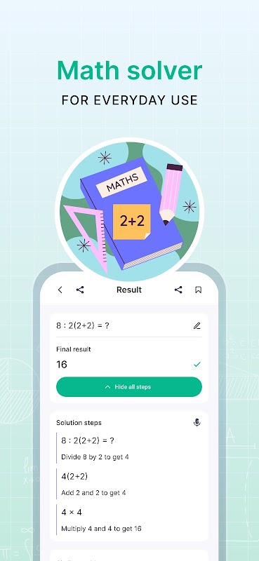 Math Solver, Ihr Android-Begleiter zur Lösung mathematischer Probleme. Scannen, schreiben oder tippen Sie Ihre Gleichungen ein, um Schritt-für-Schritt-Lösungen zu erhalten. Erleben Sie präzises und praktisches Lösen mathematischer Probleme.