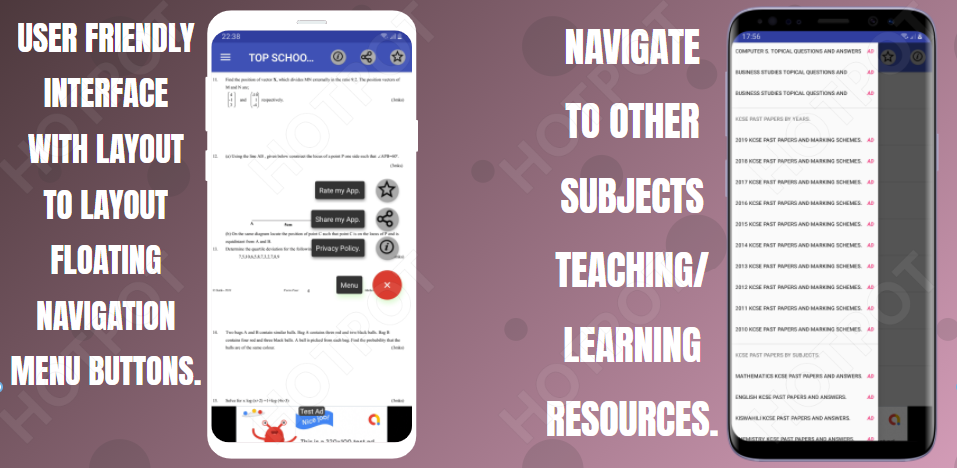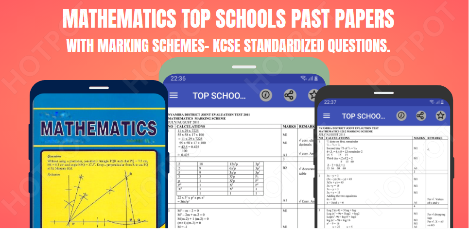 Mathematics: Top school papers mobile application gathers Mathematics papers from top Governmental schools and their marking schemes. The App is set to equip students with skills and expertise on how to tackle Mathematics Questions. It contains Question papers plus their marking schemes. This app features questions from the following topics: