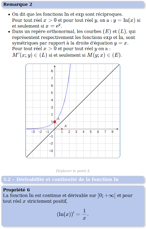Es beginnt mit den ersten Definitionen und Eigenschaften in Bezug auf die Funktion ln. Dann untersuchten die verschiedenen algebraischen, graphische und analytische Eigenschaften (Grenzen Derivat).