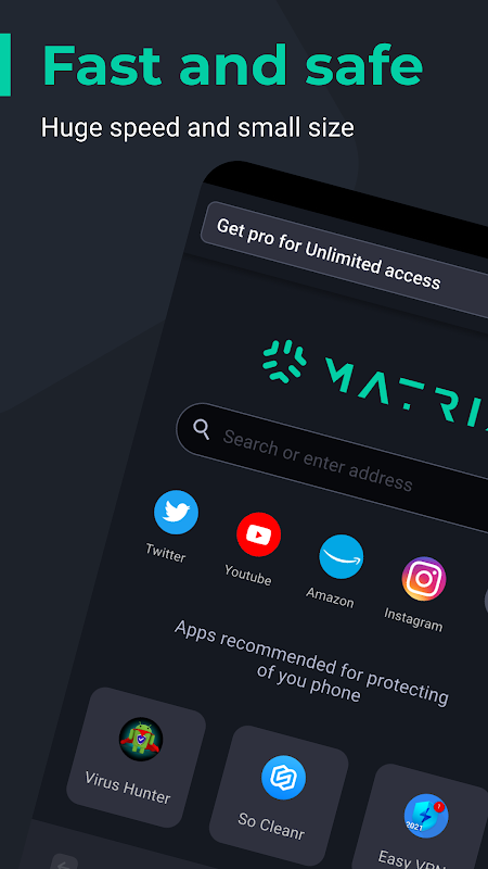 Matrix-Browser ist einer der schnellsten, einfachsten und bequemsten Browser für Ihr Smartphone. Die in alle Sprachen übersetzte Benutzeroberfläche ermöglicht es Ihnen, alle Funktionen schnell zu verstehen, und das dunkle Design schützt Ihre Augen!