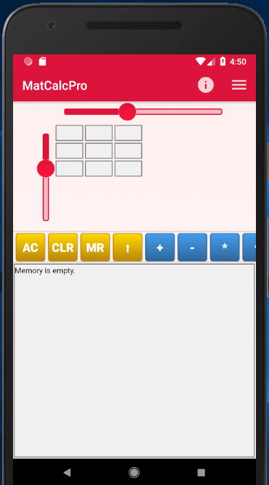 Sie können die Matrixdimensionen mithilfe der Bildlaufleisten festlegen und dann die Matrixelemente durch Eingabe in jede Zelle eingeben (die Zellen werden aktiv / inaktiv, sobald Sie die entsprechende Bildlaufleiste verschieben). Sie können zu einer anderen Zelle wechseln, indem Sie entweder die Taste WEITER auf der Softtastatur drücken oder auf die gewünschte Zelle tippen. Sie müssen keine Nullwerte eingeben. Lassen Sie einfach die entsprechende Zelle leer.